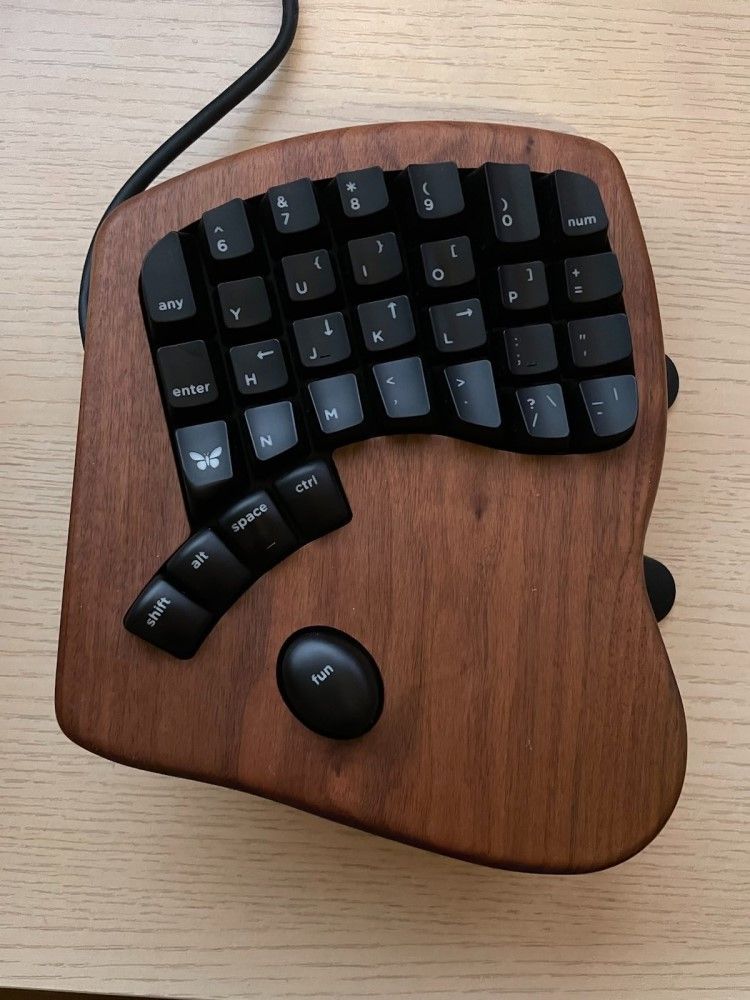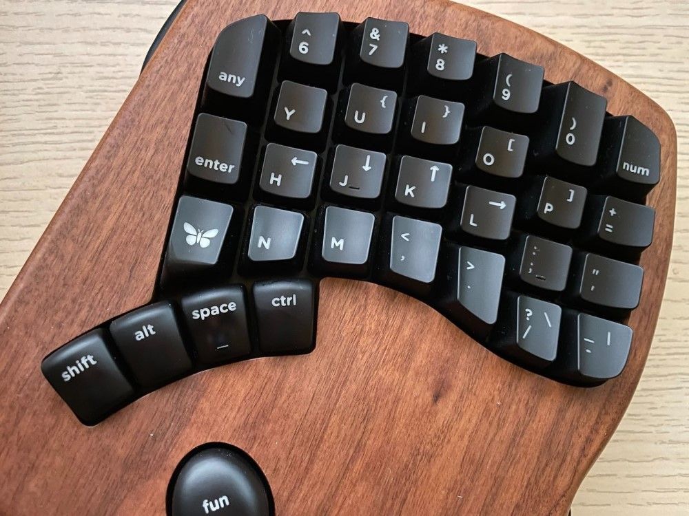 - First of all: the layout of M100 is significantly different than it was for Atreus. It's not an issue. In fact, I like M100's layout more, primarily because of how one switches the mode. There are two dedicated buttons for that ("fun": one on the right, one on the left) positioned conveniently just under your ... thenar (it's the part of your palm just under the thumb). Practically speaking, you don't have to move your hand in X or Y dimension to switch the mode. You just press the palm down because the thenar is conveniently placed (all the time) where it needs to be.