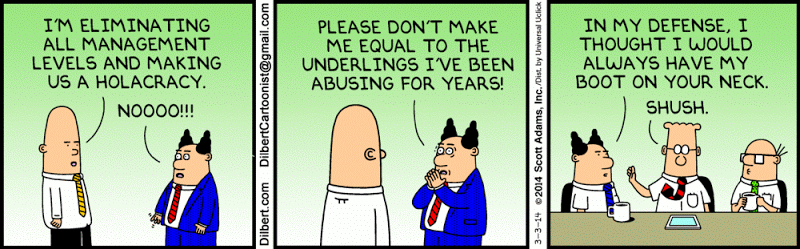 Holacracy seems like a very exciting experiment - in my case, I'll keep looking how it goes (at Zappos, but not only), but I'm far from expecting a wide adoption in nearest future.