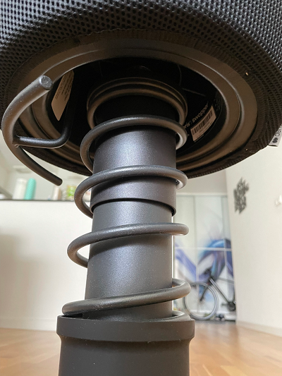 OK, so the thing is called Aeris Swopper. Calling it a 'spring' is definitely a simplification, but not that much. Theoretically (according to the producer), it's an "office chair" - in the form of stool, w/o backrest or armrests. The sitting "cushion" is round (no distinguished front, back, or sides), convex, and hard as f... (it does not deform under the weight).