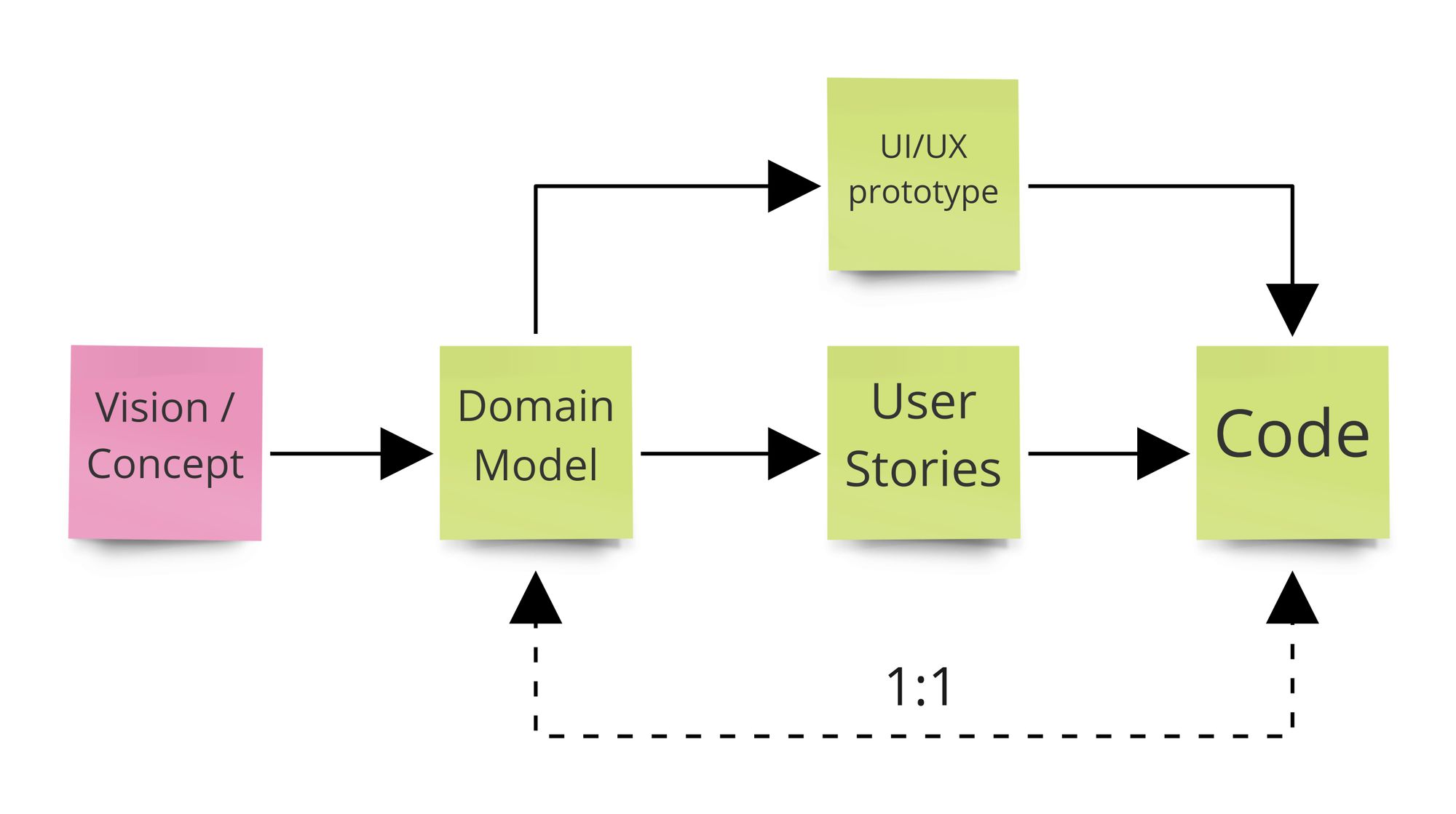 - There's a 1:1 correspondence line between Domain Model & Code